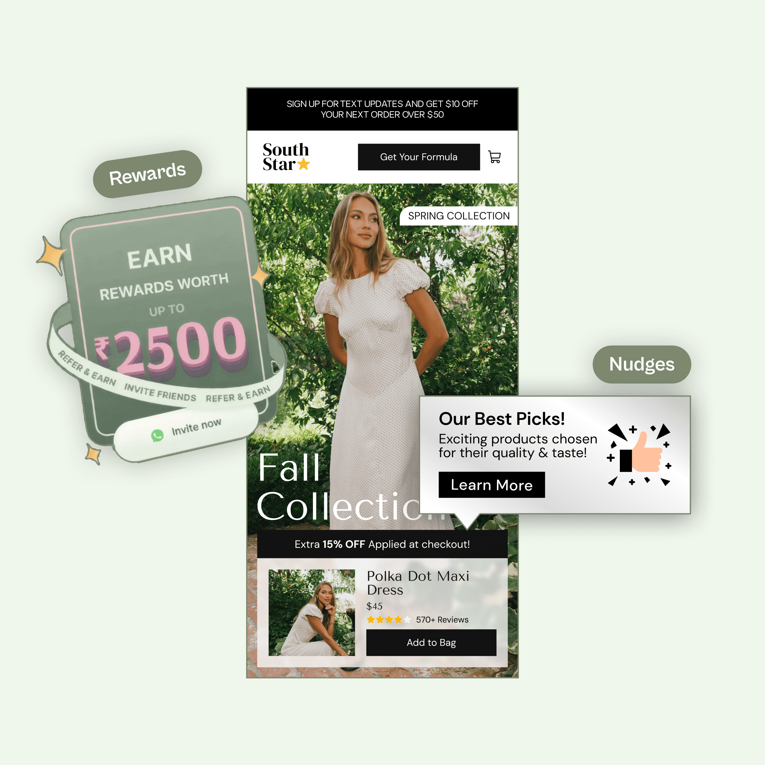 Create interactive moments that keep users engaged across their journey. Choose from an assortment of ready-to-use stories, nudges, gamification, rewards, and surveys, designed to drive action without engineering effort.