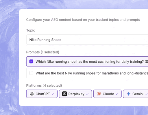 AI assistants respond to natural-language prompts like “best running shoes for flat feet under $150,” not isolated keywords. To optimize AI search presence, you need intent-aligned content that matches real questions buyers ask.