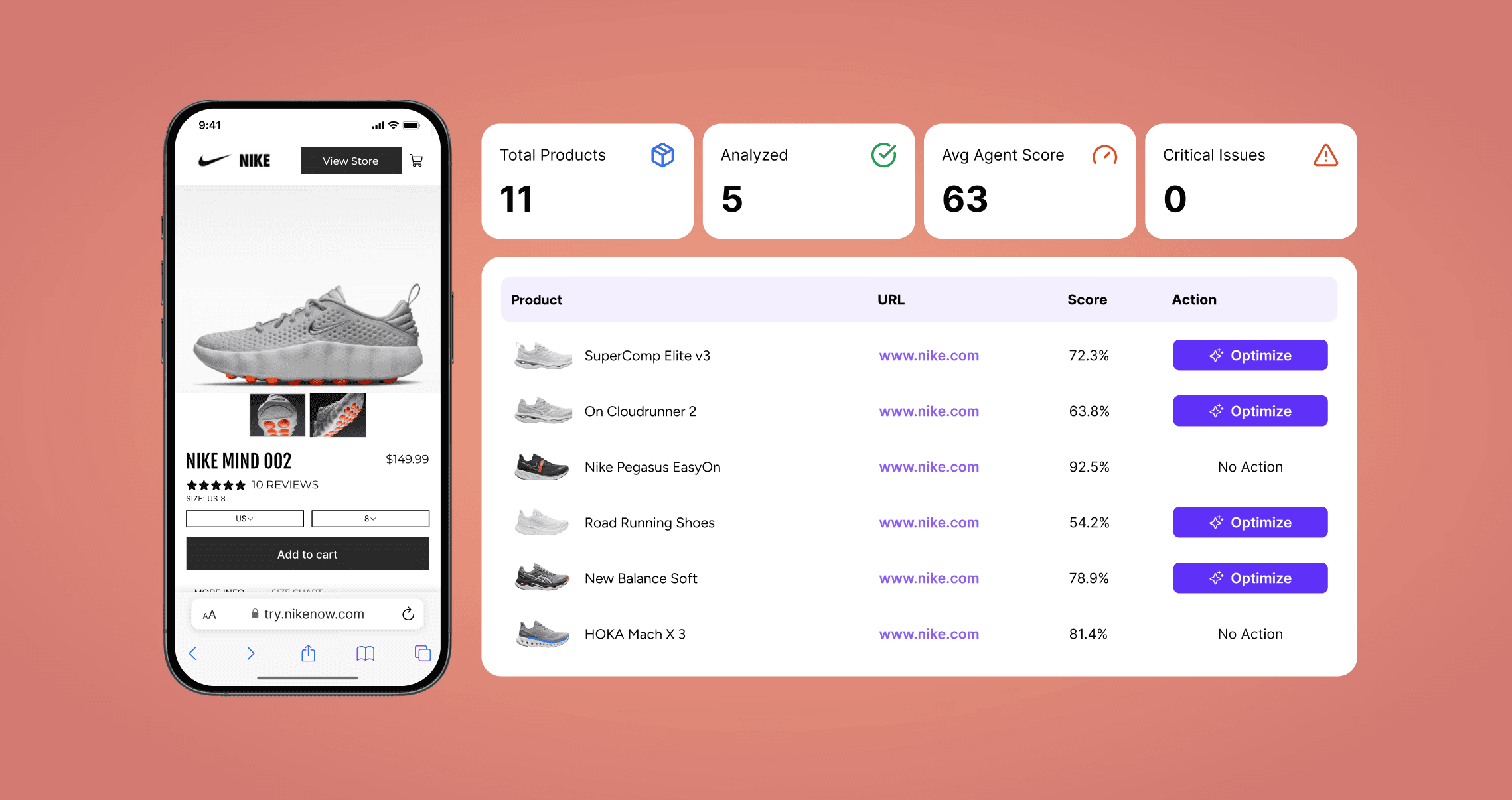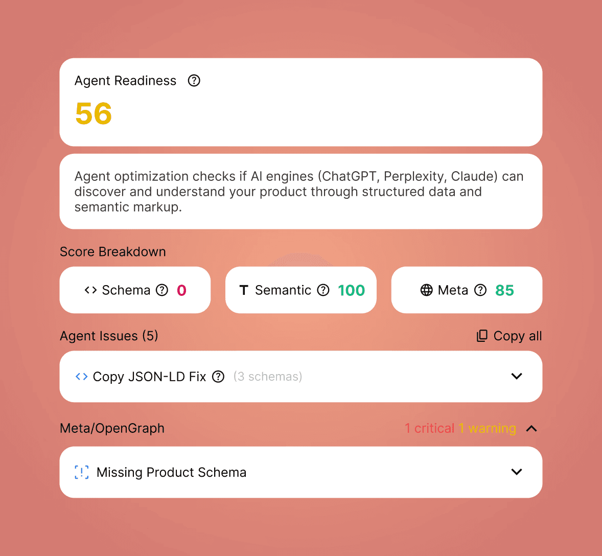 Step 1 - Nudge scores existing PDPs against the 6-layer framework. It helps identify which SKUs are missing schema, have thin copy, or lack sufficient images. Then it flags the gaps by layer so remediation is targeted, not generic.