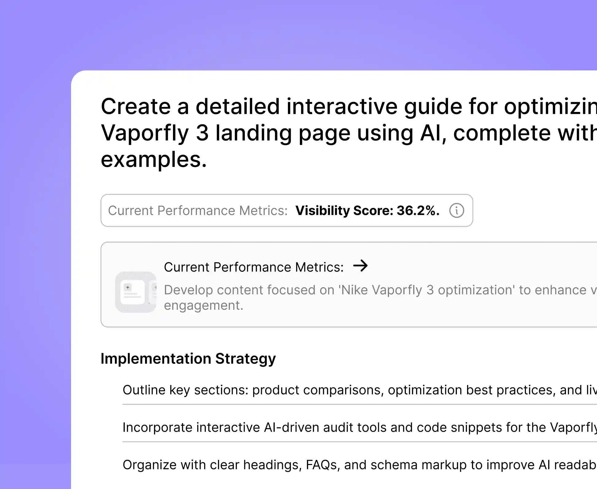 You can create AI-optimized, prompt-specific shoppable pages, product comparison flows, and funnel-style experiences that get cited by AI assistants and are designed to educate shoppers & drive conversion.