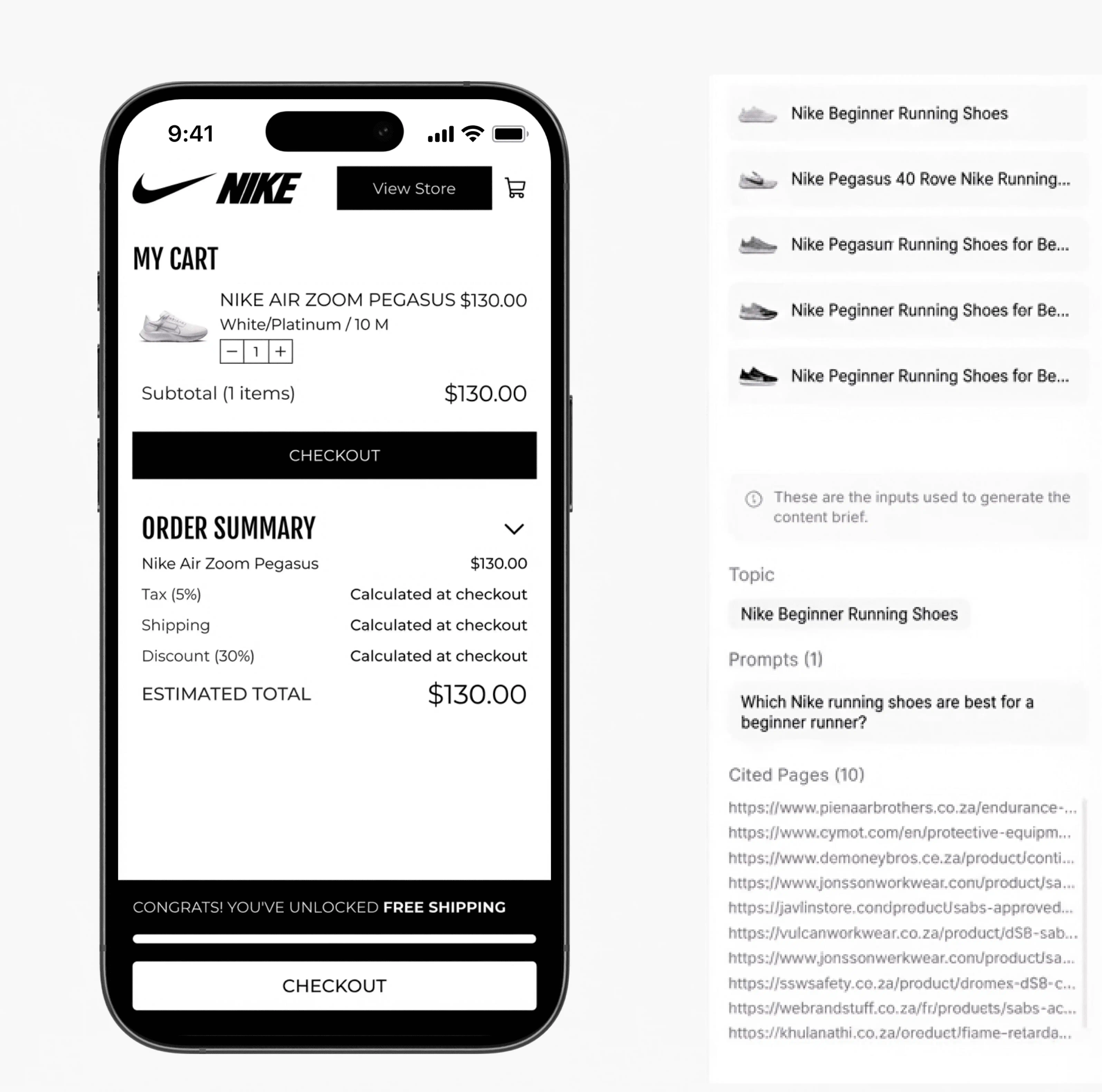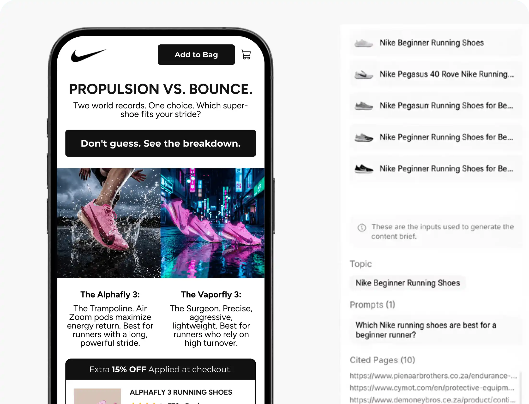 You can create AI-optimized, prompt-specific shoppable pages, product comparison flows, and funnel-style experiences that get cited by AI assistants and are designed to educate shoppers & drive conversion.