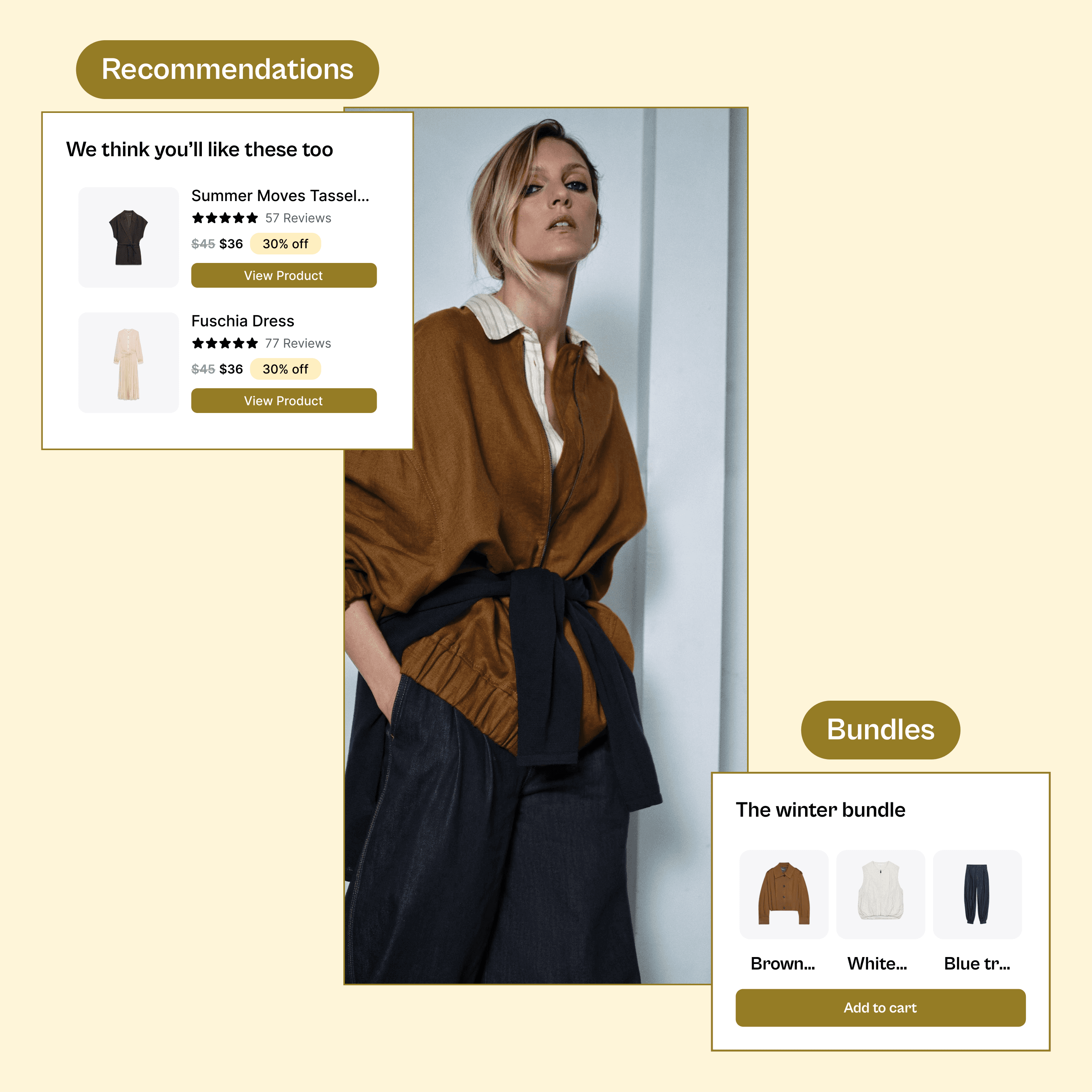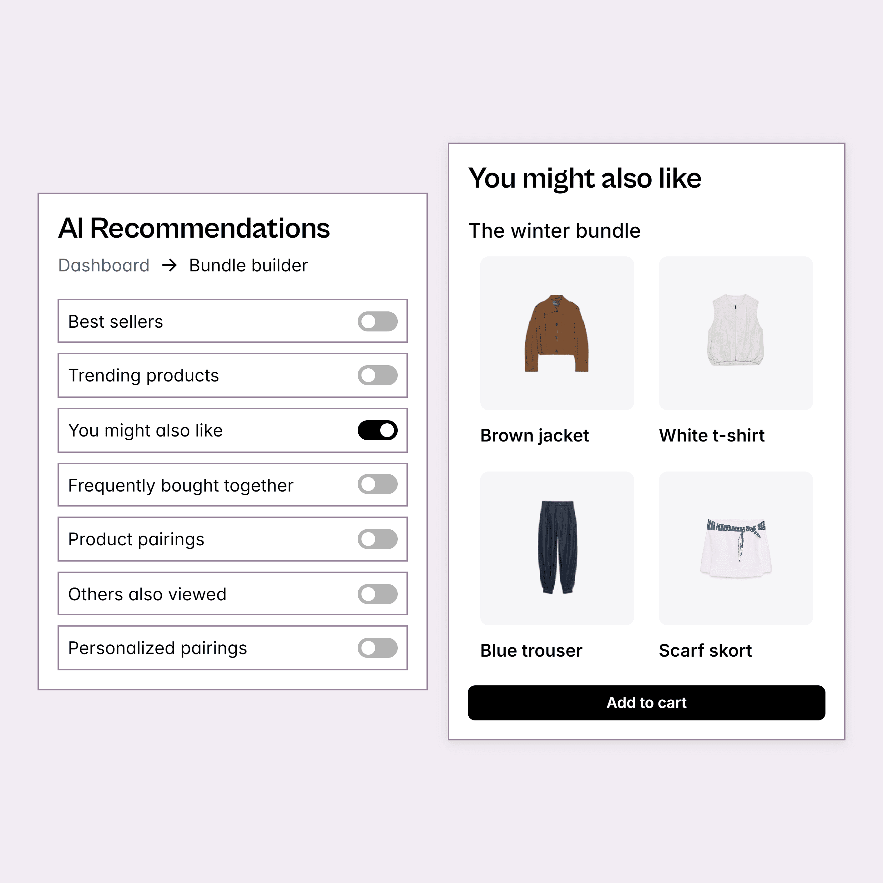 Create high-performing bundles with intelligent product pairings, you-might-also-like, and frequently bought together logic—all tied to inventory and affinities.