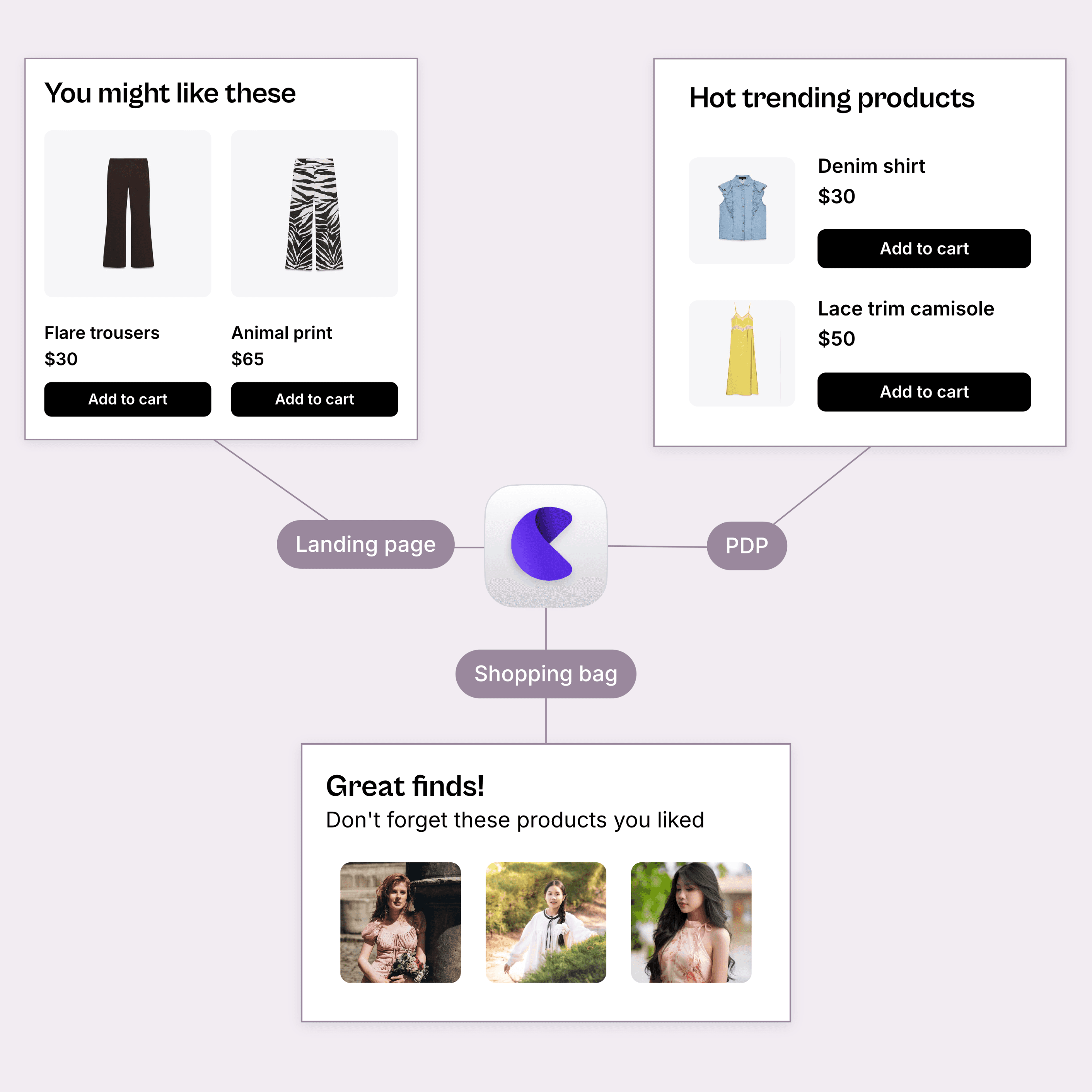 Show recs across PDPs, PLPs, shopping bags, exit, and post-purchase pages, automatically tuned to shopper journey stage and performance.