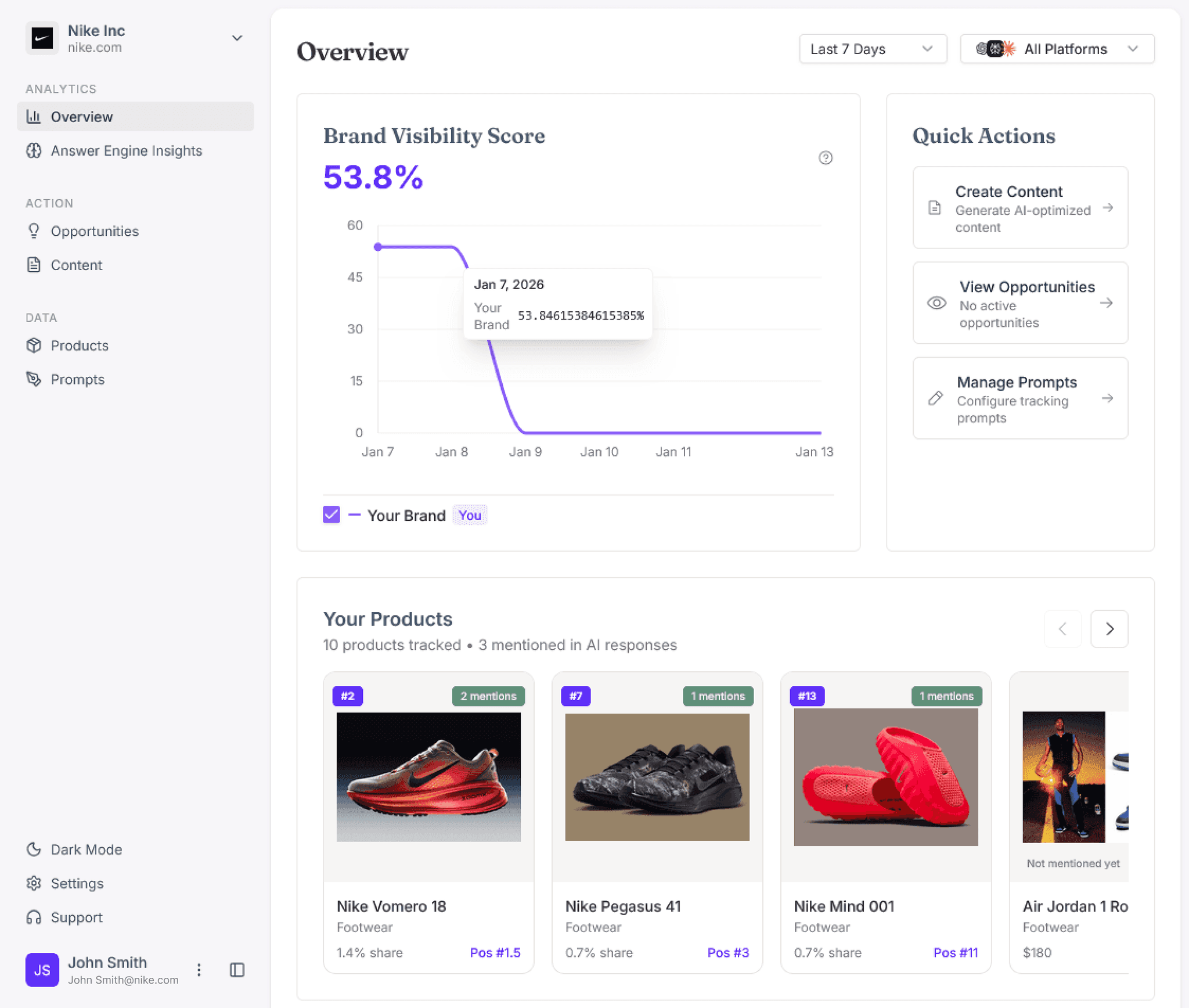Most AI visibility tools like Profound stop at brand-level mentions. Nudge tracks both brand and SKU-level prompts, so commerce teams can see exactly which products get recommended, which don’t, and why.